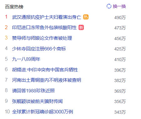10.全球累計(jì)新冠確診超3000萬例 獵頭熱點(diǎn)熱度343萬