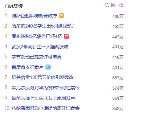 1. 特斯拉起訴特朗普政府 獵頭熱點(diǎn)熱度480萬