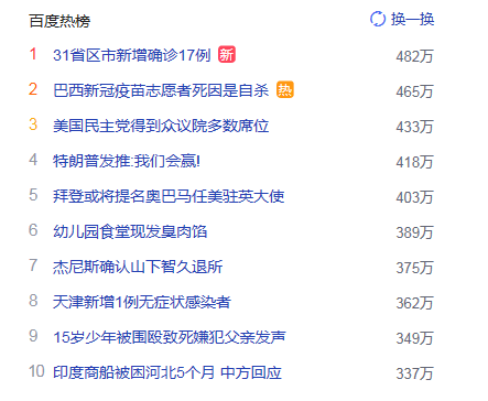 2. 巴西新冠疫苗志愿者死因是自殺 獵頭熱度熱點(diǎn)465萬(wàn)