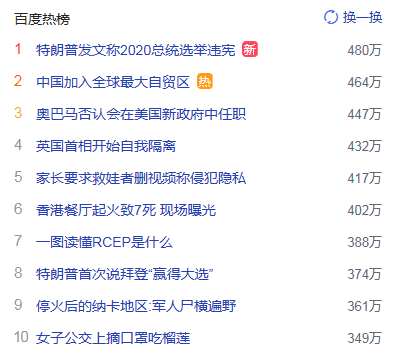 1. 特朗普發(fā)文稱2020總統(tǒng)選舉違憲 獵頭熱度熱點480萬