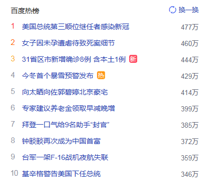 1. 美國總統(tǒng)第三順位繼任者感染新冠  獵頭熱度熱點(diǎn)477萬