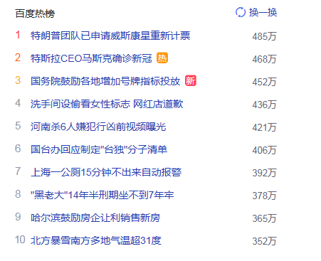 2. 特斯拉CEO馬斯克確診新冠 獵頭熱度熱點(diǎn)468萬