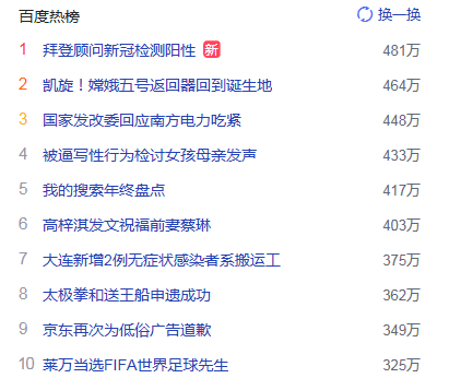 1. 拜登顧問(wèn)新冠檢測(cè)陽(yáng)性 獵頭熱度熱點(diǎn)481萬(wàn)