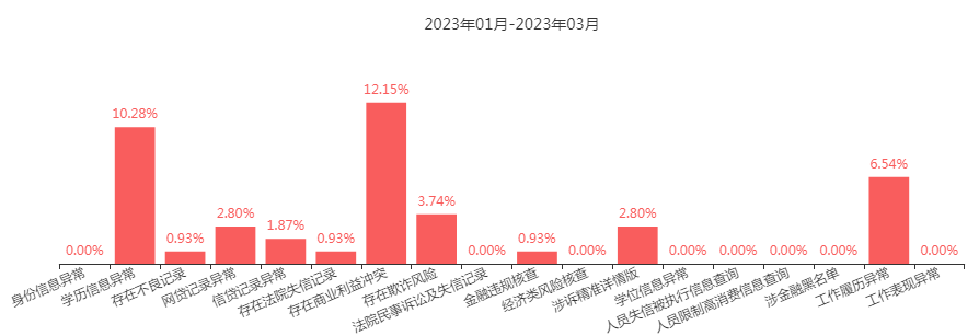 存在欺詐風(fēng)險(xiǎn)占比3.74%,背調(diào)異常項(xiàng)目的NO.4,欺詐風(fēng)險(xiǎn)即惡意欺騙的風(fēng)險(xiǎn),是操作風(fēng)險(xiǎn)的一種,是制度不完善和內(nèi)控不充分導(dǎo)致的風(fēng)險(xiǎn),欺詐風(fēng)險(xiǎn)在國(guó)內(nèi)尤其突出。對(duì)于現(xiàn)金貸而言,形式有多重身份偽冒、中介黑產(chǎn)、內(nèi)外勾結(jié)、套現(xiàn)等。對(duì)于電商而言,形式為薅羊毛、刷單、刷好評(píng)、運(yùn)費(fèi)欺詐等。如果顯示存在欺詐風(fēng)險(xiǎn)可能是對(duì)方之前的交易記錄產(chǎn)生過(guò)問(wèn)題或者被人舉報(bào)過(guò)。